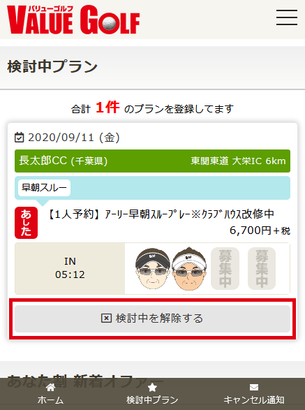 「検討中プランに登録」ボタンに文字が変われば、解除終了です。